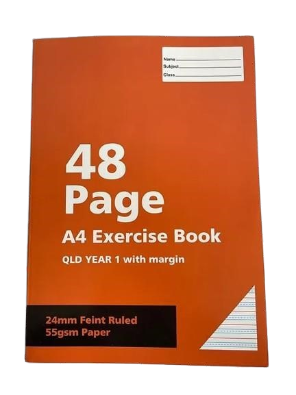 A4 Exercise Book – 48 Pages, 24mm Ruled, QLD Year 1 with Margin – 55gsm Paper (Buy in Multiples of 12) Specially designed for Queensland Year 1 students, this A4 Exercise Book comes with 48 pages of 55gsm paper and 24mm feint ruled lines with margin, making it perfect for developing early handwriting skills. The wide ruling supports young learners in forming clear and legible letters, while the durable cover with a label section makes organisation simple. Ideal for school use, homework, and handwriting practice.