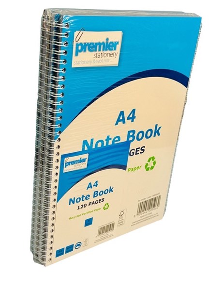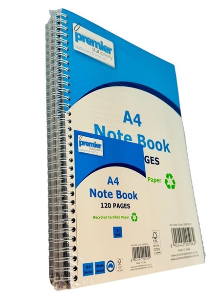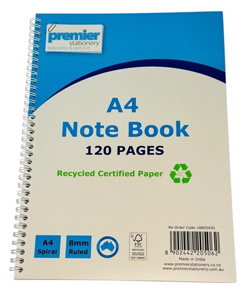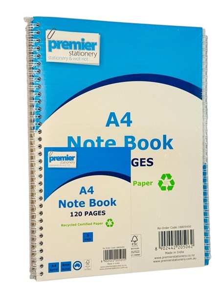 A4 Size: Spacious pages for extensive note-taking. 120 Pages per Notebook: Plenty of space for all your notes and ideas. 8mm Ruled Lines: Standard line spacing for clean and structured writing. FSC Certified Recycled Paper: Environmentally responsible and sustainable. Spiral Bound: Opens flat for easy writing and page turning. Value Pack: Includes 5 notebooks — perfect for school or bulk office use. Durable Cover: Protects pages for long-lasting use.