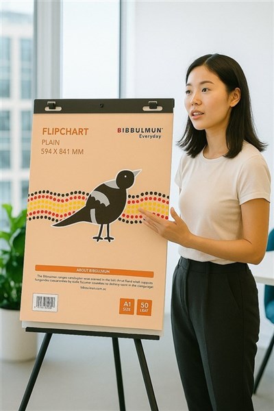 Bibbulmun Everyday Flipchart Pad – A1 Size, 50 Leaf, Plain – 594 x 841 mm Elevate your presentations, meetings, and brainstorming sessions with the Bibbulmun Everyday Flipchart Pad. Designed in A1 size (594 x 841 mm), this flipchart pad features 50 high-quality plain sheets ideal for drawing, writing, and sketching. With pre-punched holes, it's compatible with most flipchart easels. The stylish design includes a culturally significant artwork that reflects the Bibbulmun brand's commitment to supporting Indigenous communities through the Bibbulmun Fund. Whether in classrooms, boardrooms, or creative spaces, this pad is a versatile tool for effective visual communication.