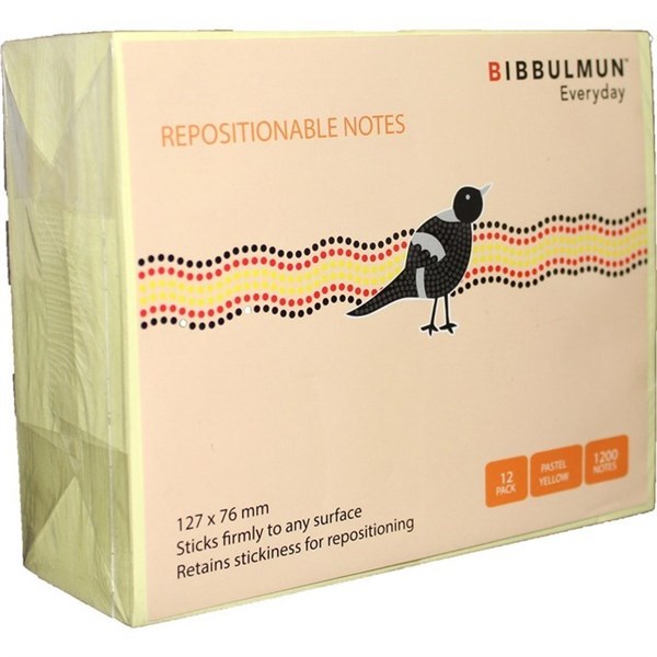 Bibbulmun Repositionable Sticky Notes 76 x 127mm – Pastel Yellow | Pack of 12 (1200 Notes Total) Bibbulmun Repositionable Sticky Notes in a vibrant pastel yellow shade. Designed for everyday use, these sticky notes provide a strong grip on any surface while allowing for clean removal and easy repositioning—perfect for professionals, students, and home organization. Sized at 76mm x 127mm, these rectangular sticky notes give you more space to write detailed instructions, quick notes, or list items. The premium adhesive backing ensures they stay put, whether on notebooks, desks, walls, doors, laptops, or whiteboards—without leaving residue. The Bibbulmun range contributes part-proceeds to the Bibbulmun Fund and is identified by the distinctive magpie icon. The Bibbulmun Fund invests in targeted community projects that are run by community members and have support from local leaders. It encourages, supports and inspires Indigenous communities across Australia.