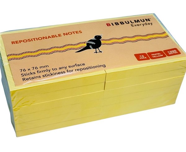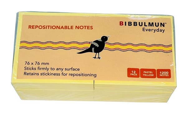 BIBBULMUN STICKY NOTES 76X76mm Yellow Pack of 12 Stay organised and never miss a reminder with the Bibbulmun Sticky Notes 76x76mm Yellow – Pack of 12. Perfect for jotting down quick notes, important memos, or marking documents, these repositionable notes are a must-have for homes, offices, and classrooms. Each note sticks firmly to most surfaces yet peels off cleanly without leaving residue, making it ideal for temporary labeling or reminders. The bright pastel yellow colour ensures your messages stand out, while the compact square size fits perfectly on desks, notebooks, and monitors. With 12 pads and a total of 1200 sheets, this value pack ensures you're always stocked up for daily note-taking. The Bibbulmun range contributes part-proceeds to the Bibbulmun Fund and is identified by the distinctive magpie icon. The Bibbulmun Fund invests in targeted community projects that are run by community members and have support from local leaders. It encourages, supports and inspires Indigenous communities across Australia.