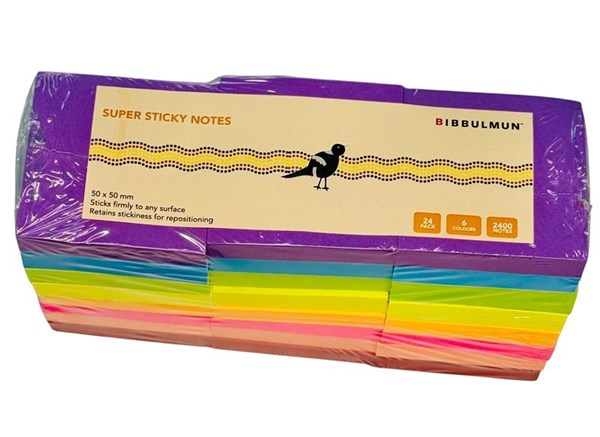 Bibbulmun Super Sticky Notes 50mm x 50mm – Assorted Colours, Pack of 24 (2400 Notes) Stay organised and add a splash of colour to your notes with Bibbulmun Super Sticky Notes. Measuring 50mm x 50mm, these compact sticky notes are perfect for reminders, quick notes, and bookmarks. The super adhesive backing ensures they stick firmly to any surface while allowing easy repositioning without leaving residue. With 24 pads in 6 vibrant colours and a total of 2400 notes, this pack is ideal for home, office, or school use. The Bibbulmun range contributes part-proceeds to the Bibbulmun Fund and is identified by the distinctive magpie icon. The Bibbulmun Fund invests in targeted community projects that are run by community members and have support from local leaders. It encourages, supports and inspires Indigenous communities across Australia.
