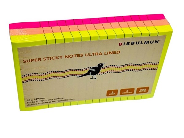 • Take your notes and reminders to the next level with Bibbulmun Super Sticky Notes Ultra Lined. Featuring lined pages for neat writing, these sticky notes are perfect for lists, memos, and organised reminders. The strong adhesive ensures they stick firmly to most surfaces while still allowing repositioning without losing tackiness. This pack includes 3 assorted neon colours for high visibility and effective organisation. With a larger 98mm x 149mm size, they provide plenty of writing space while remaining easy to use at home, school, or the office. The Bibbulmun range contributes part-proceeds to the Bibbulmun Fund and is identified by the distinctive magpie icon. The Bibbulmun Fund invests in targeted community projects that are run by community members and have support from local leaders. It encourages, supports and inspires Indigenous communities across Australia.