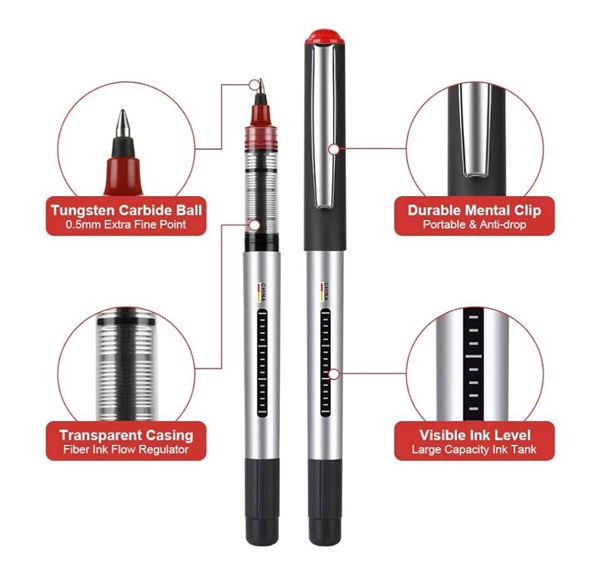 0.5mm Tungsten Carbide Tip – Provides extra fine, smooth, and precise writing. Rollerball Ink Technology – Delivers effortless, quick-drying, and smudge-free writing. Visible Ink Level – Transparent casing with large ink capacity for extended use. Durable Metal Clip – Portable, strong, and anti-drop for on-the-go convenience. Fiber Ink Flow Regulator – Ensures consistent ink distribution without skipping. Bulk Pack of 12 – Ideal for schools, offices, and bulk users.