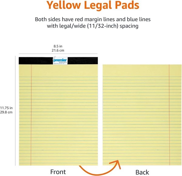 Premier Legal Writing Pads – Canary Yellow, 50 Sheets per Pad, 10 Pads (A4 Size, Wide Ruled) Stay organized and productive with Premier Legal Writing Pads, the ultimate solution for efficient note-taking, drafting, and organizing thoughts. Designed for professionals, students, and anyone who values clarity in their writing, these pads offer both function and finesse. Each pad features premium-grade canary yellow paper, wide ruled with margins, and is micro-perforated for clean sheet removal. Whether you're in the office, the classroom, or working from home, these legal pads are built to meet your daily writing demands. With 10 pads per pack and 50 sheets per pad, you get a generous 1000 pages of smooth writing surface, ensuring you never run out when inspiration or planning strikes.
