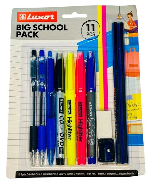 The Luxor Big School Pack is the perfect stationery set for students, combining everyday writing essentials in one convenient pack. Designed for school, college, and home use, this pack ensures you’re always ready for note-taking, highlighting, and organizing your work. Pack Contents (11 Pieces): 2 × Sprint Grip Ball Pens 1 × Micra Ball Pen 1 × CD/DVD Marker 2 × Highlighters (Yellow & Pink) 1 × Sign Pen 1 × Eraser 1 × Sharpener 2 × Wooden Pencils