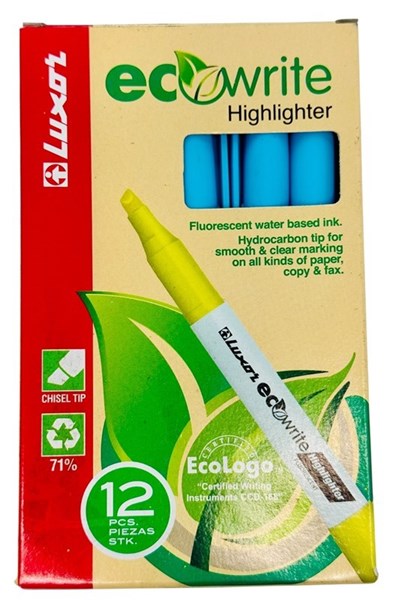 Add a splash of color while caring for the environment with the Luxor EcoWrite Fluorescent Blue Highlighters. Made with 71% recycled materials, these eco-friendly highlighters are ideal for conscious consumers who value sustainability without compromising performance. Featuring a chisel tip for both broad and fine highlighting, these highlighters offer smooth, consistent ink flow with water-based, non-toxic, and vibrant fluorescent blue ink. The lightweight body and clip-on cap add convenience for everyday use, whether in school, office, or at home. Packaged in a recyclable box of 12, these markers are a great value for bulk buyers who care about their environmental impact.