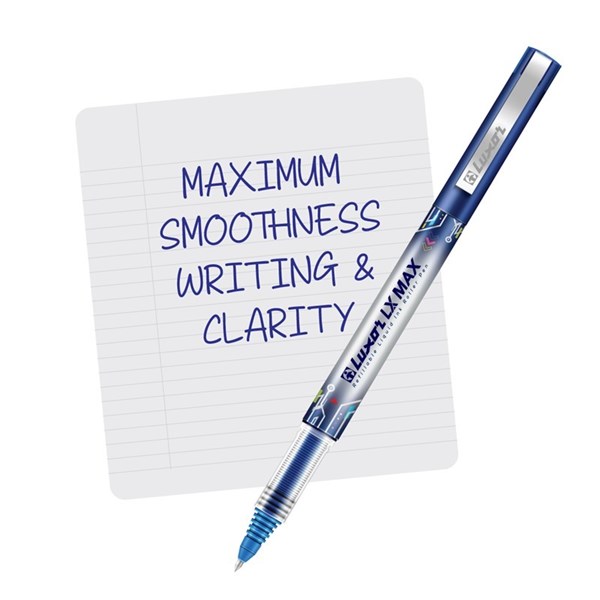 The Luxor LX Max Cone Tip Pen (Pack of 12) is designed for long-lasting, ultra-smooth writing performance. Equipped with advanced German ink technology, these pens deliver consistent ink flow for effortless writing every time. With waterproof ink available in Black, Blue, and Red, the LX Max pen ensures durability and clarity on paper. Built for both students and professionals, its cone tip design provides precision and comfort, while its long-lasting ink capacity (1000+ metres) makes it perfect for extended writing tasks. Reliable, smooth, and stylish – Luxor LX Max is your everyday writing partner.