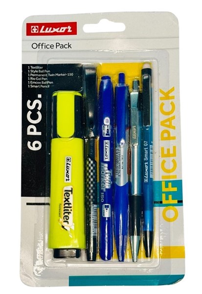 The Luxor Office Pack is a compact and professional stationery kit designed for office, business, and study use. It combines essential writing and highlighting tools in one convenient pack, making it a must-have for professionals, students, and home offices. Pack Contents (6 Pieces): 1 × Textliter (Highlighter) 1 × Style Ball Pen 1 × Permanent Twin Marker 150 1 × Rio Gel Pen 1 × Emcee Ball Pen 1 × Smart Pencil (0.7mm)