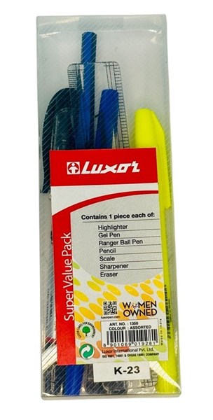 The Luxor Super Value Pack is a handy stationery kit designed for school, college, office, or home use. Packed with essential writing and study tools, it ensures you have everything you need for daily tasks in one compact set. Contents (7 Pieces): 1 Highlighter (Fluorescent) 1 Gel Pen (Neo Gel) 1 Ranger Ball Pen 1 Pencil (HB/2B) 1 Scale (15 cm) 1 Sharpener 1 Eraser