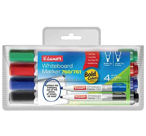 The Luxor Whiteboard Marker 760 is designed for smooth writing and easy erasability, making it the perfect choice for offices, schools, training rooms, and homes. This wallet pack includes 4 vibrant assorted colours (Black, Blue, Red, Green) with bullet tips for bold and clear writing. The markers feature a quick-drying, low-odor ink formula that wipes off easily without leaving stains, ensuring your whiteboard stays clean and fresh after every use. Ideal for daily use in meetings, classrooms, or home study sessions, these markers are both reliable and long-lasting.