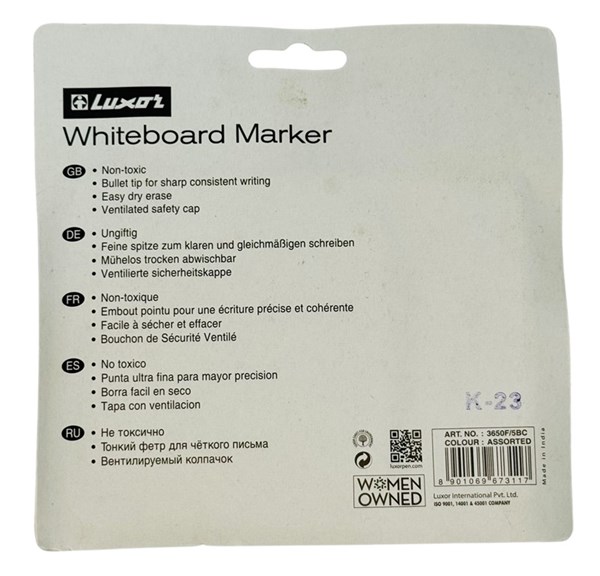 Make your presentations and lessons more engaging with the Luxor Whiteboard Marker Pen Set (Pack of 5). This value pack (4+1 free) includes Black, Blue, Red, and Green bright vivid colors for smooth writing on whiteboards. The bullet tip design ensures clear, bold lines, perfect for classrooms, offices, and meetings. With low-odor, xylene/toluene-free ink, these markers are safe for everyday use. They write smoothly, erase easily without leaving stains, and work perfectly on all glass and non-porous surfaces