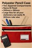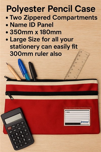 Keep all your school or office essentials organised with this durable Polyester Pencil Case. Designed with two zippered compartments, it offers easy storage for pens, pencils, markers, sharpeners, calculators, and more. The large 350mm x 180mm size comfortably fits a 300mm ruler, making it perfect for students who need extra space. The built-in Name ID panel allows for easy personal identification—ideal for classrooms, workplaces, and travel. Made from strong polyester fabric, this pencil case is built to last and withstand daily use.