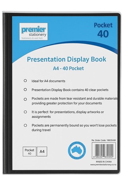 Organize your important documents, assignments, or artwork in style with the Premier Presentation Display Book. This A4-sized display book is designed to keep your papers protected and presentable. Featuring 40 clear, tear-resistant pockets, this file is perfect for professional presentations, portfolios, or schoolwork. The insertable front cover allows for easy personalization or labeling. Lightweight yet sturdy, it’s an ideal solution for keeping your documents tidy whether you're at the office, home, or on the go.