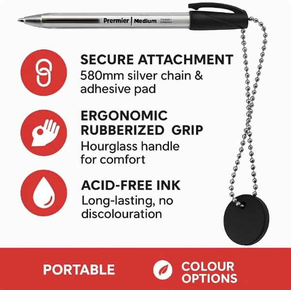 Keep pens secure and always within reach with the Premier Chainlink Captive Ballpoint Pen. Designed for banks, offices, receptions, retail counters, libraries, and other public spaces, this pen comes with a durable chrome chain and self-adhesive base pad, ensuring it stays in place and prevents loss. Each pen is fitted with a 1.0mm medium point tip, delivering smooth and consistent ink flow for everyday writing tasks. The chainlink design allows for easy, flexible movement while keeping the pen firmly attached to its base. The included self-adhesive pad makes installation simple – just attach the base to any flat surface for convenient access.