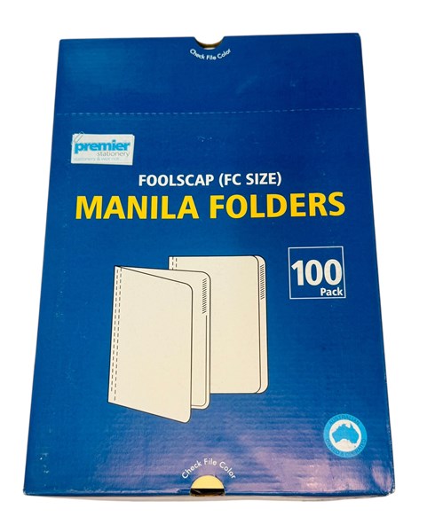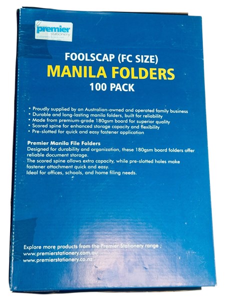 Premier Foolscap Manila Folders Buff – 100 per Pack - Heavy Duty 180 GSM durable Manilla Board Folders - for Office & School & Home