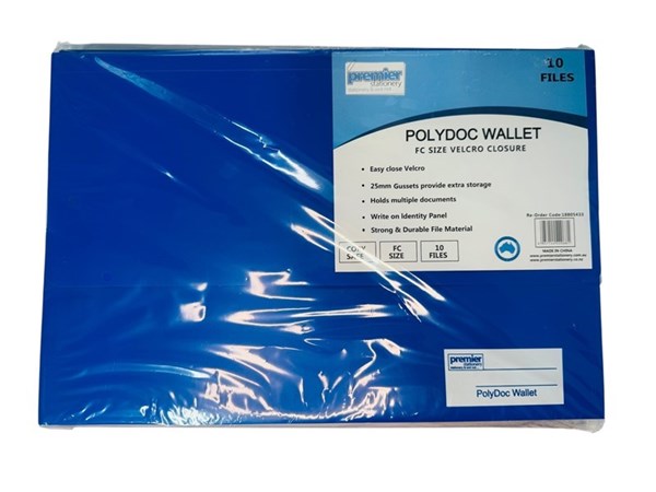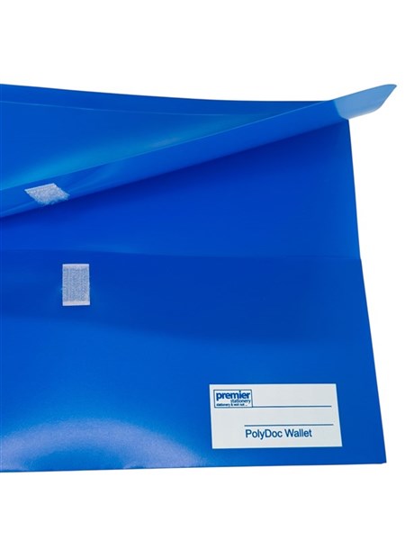 Premier Stationery PolyDoc Wallet – Foolscap Size (FC) | Blue Document File Folder with Velcro Closure, 25mm Gusset | Pack of 10 Durable Polypropylene File Wallets The Premier Stationery PolyDoc Wallet in Foolscap (FC) size is the perfect choice for organizing and protecting your important papers, contracts, reports, and office documents. Made from strong and durable polypropylene, these file wallets are resistant to wear, spills, and tearing. Featuring a secure Velcro closure and a 25mm gusset, each wallet provides extra storage space for bulk documents. The write-on identity panel allows for easy labeling and quick document identification. Available in a professional blue color, these wallets are ideal for offices, schools, and home filing systems. Pack includes 10 PolyDoc Wallets for efficient document management.
