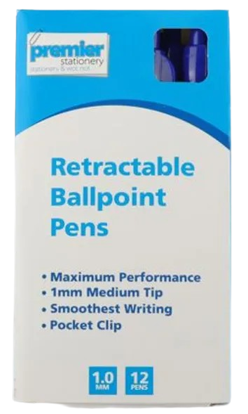 Premier Retractable Ballpoint Pen Blue – 1.0 mm Medium Tip | Pack of 12 (Buy in Multiples of 12)