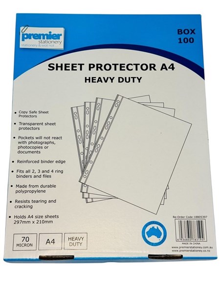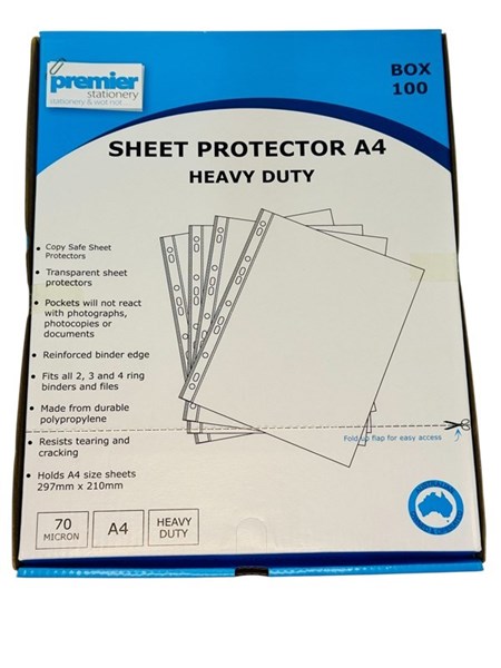 Premier Sheet Protector A4 – Crystal Clear, Heavy Duty, 70 Micron Thickness (Buy in Multiples of 12) Protect and preserve your important documents with Premier A4 Sheet Protectors. Crafted from heavy-duty 70-micron crystal-clear polypropylene, these sleeves provide superior durability while keeping your documents easily readable. They are copy-safe, ensuring no reaction with photographs, photocopies, or printed text, making them ideal for both professional and personal use.