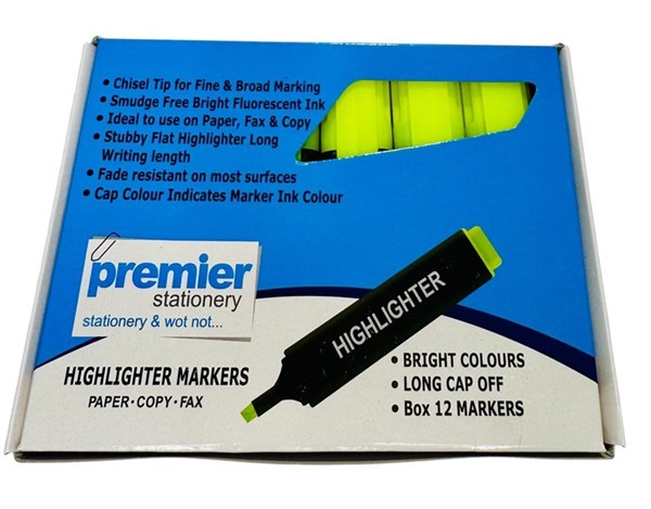Premier Yellow Highlighter Markers – Pack of 12 Stay organized and highlight important text effortlessly with Premier Stationery Yellow Highlighter Markers. Designed with a vibrant fluorescent yellow ink and a chisel tip for both fine and broad marking, these highlighters are ideal for students, professionals, and anyone needing clear visibility on paper, copy, or fax documents. The smudge-free ink dries quickly, and the flat, stubby design ensures a comfortable grip with long-lasting use. Whether for office, school, or home, this box of 12 delivers reliable quality with standout brightness.