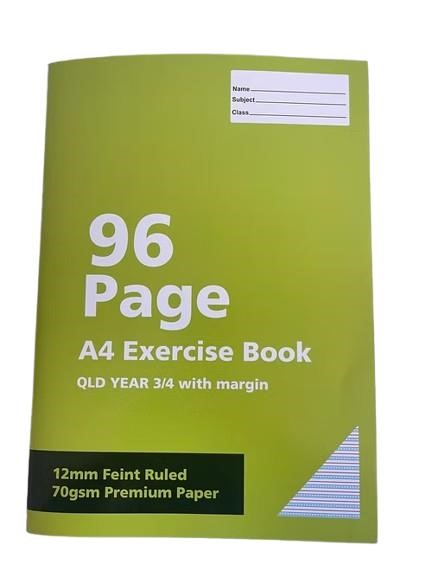 Premium A4 Exercise Book – 96 Pages, QLD Year 3/4 Ruled with Margin – 70gsm Paper (Pack of 12)