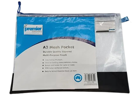 The Premier A3 Mesh Pouch with Note Card Holder is a durable, multi-purpose storage solution perfect for school, office, and home organisation. Made from strong PP mesh material with a reinforced nylon bottom, this pouch is built to withstand daily wear and tear. Its spacious A3 size offers ample room for books, stationery, documents, art supplies, or even travel essentials. The secure zip closure keeps everything safe, while the front name/ID card holder makes it ideal for students and professionals who need easy identification. A must-have item on every Back-to-School Book List.