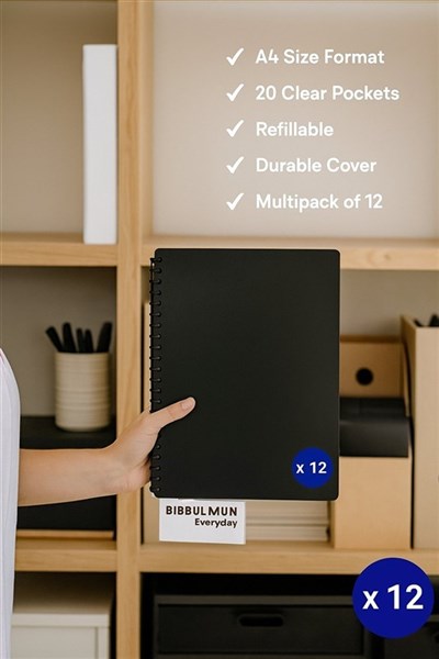 Bibbulmun A4 Display Book – 20 Pocket – Black – Refillable – Pack of 10 Organize your documents with confidence and style using the Bibbulmun Display Book A4 with 20 Pockets. Designed for durability and everyday use, this display book features a sleek black polypropylene cover and refillable clear pockets, making it perfect for presenting reports, storing certificates, project work, training materials, or keeping your personal documents safe. Each display book holds up to 40 sheets (double-sided) and is equipped with acid-free, non-stick pockets to protect your documents from damage or fading. The refillable spiral binding makes it easy to add or remove pockets, giving you full control over how you use it. Ideal for professionals, students, teachers, and anyone who values smart organization. Whether you're buying for the office, classroom, or bulk supply needs, this pack of 12 provides excellent value and functionality.
