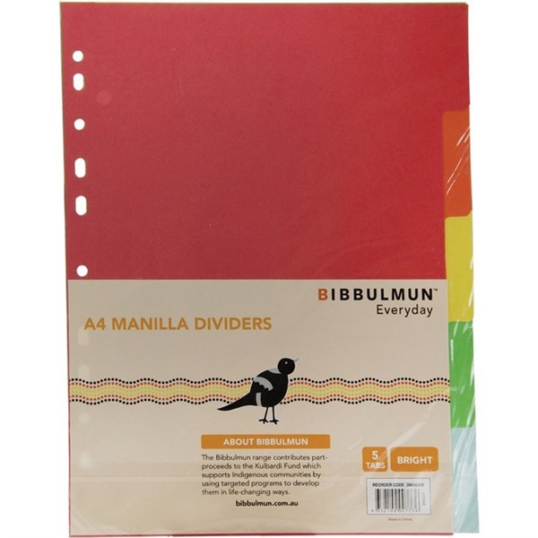 Bibbulmun A4 Manilla Dividers – 5 Tabs – Bright Colours Bring colour and order to your folders with the Bibbulmun A4 Manilla Dividers 5 Tab Plain Bright Colours. These vibrant A4 manilla board dividers make it easy to separate documents, projects, or sections in your binders and files. Each pack contains 5 brightly coloured tabs — perfect for colour-coding subjects, categories, or projects at school, in the office, or at home. The blank tabs give you the flexibility to label them however you like. The multi-punched reinforced spine fits all standard 2, 3, or 4 ring binders and lever arch files, making these dividers a reliable everyday filing solution. The Bibbulmun range contributes part-proceeds to the Bibbulmun Fund and is identified by the distinctive magpie icon. The Bibbulmun Fund invests in targeted community projects that are run by community members and have support from local leaders. It encourages, supports and inspires Indigenous communities across Australia.