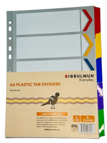 Bibbulmun A4 Plastic Reinforced Tab Dividers – 5 Coloured Tabs – White Index Sheets Stay organised and find your documents faster with the Bibbulmun A4 Plastic Tab Dividers with Reinforced 5 Coloured Tabs. Perfect for students, teachers, and office professionals, these A4 file dividers with coloured tabs are made from durable, high-quality plastic for long-lasting everyday use. Each pack includes 5 brightly coloured tabs (red, yellow, blue, purple, green) for easy sectioning and quick reference. The white lined index sheets allow you to write clear labels for better document management. These multi-punched plastic dividers fit all standard 2, 3, or 4 ring binders and lever arch files, making them a versatile choice for school folders, office files, or home organisation. Upgrade your filing system with these reliable A4 plastic binder dividers with write-on tabs — a practical solution for keeping your paperwork neat, sorted, and accessible. The Bibbulmun range contributes part-proceeds to the Bibbulmun Fund and is identified by the distinctive magpie icon. The Bibbulmun Fund invests in targeted community projects that are run by community members and have support from local leaders. It encourages, supports and inspires Indigenous communities across Australia.