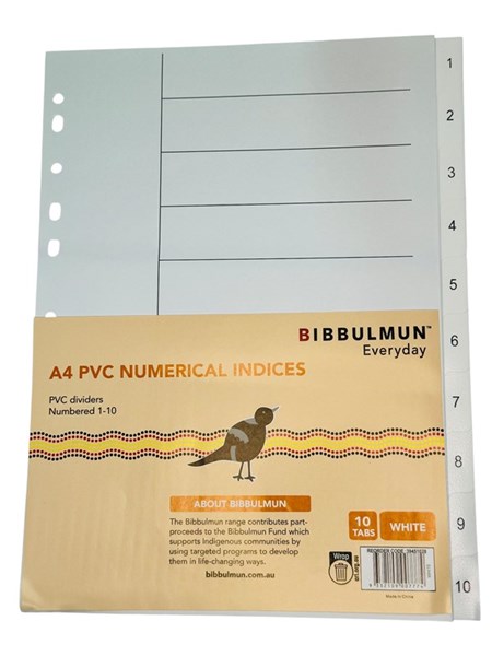 Bibbulmun A4 PVC Numerical Index Dividers – 1–10 Tabs – White Stay organised and professional with the Bibbulmun A4 PVC Numerical Index Dividers 1–10 Tabs. These practical A4 white numbered tab dividers help you separate documents into clear, easy-to-navigate sections. Perfect for students, teachers, and professionals, these durable PVC dividers are built for daily handling and frequent reference. Each pack includes 10 sturdy white tabs, clearly numbered from 1 to 10 for easy sectioning of reports, presentations, manuals, or large files. The lined index page lets you customise section labels for quick reference. The multi-punched spine fits all standard 2, 3, or 4 ring binders and lever arch files. The Bibbulmun range contributes part-proceeds to the Bibbulmun Fund and is identified by the distinctive magpie icon. The Bibbulmun Fund invests in targeted community projects that are run by community members and have support from local leaders. It encourages, supports and inspires Indigenous communities across Australia.