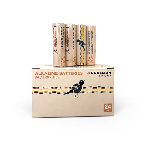 Power your everyday devices with reliable performance using Bibbulmun Everyday AA Alkaline Batteries. Designed for consistent and long-lasting energy, these 1.5V AA batteries are ideal for use in remotes, clocks, cameras, flashlights, toys, wireless mice, and more. Featuring beautiful and unique Aboriginal-inspired packaging, they combine dependable utility with thoughtful design. These batteries are mercury and cadmium-free, ensuring environmental safety while delivering strong power output. With a long shelf life and dependable leak protection, Bibbulmun batteries are perfect for bulk storage or regular household use. The Bibbulmun range contributes part-proceeds to the Bibbulmun Fund and is identified by the distinctive magpie icon. The Bibbulmun Fund invests in targeted community projects that are run by community members and have support from local leaders. It encourages, supports and inspires Indigenous communities across Australia