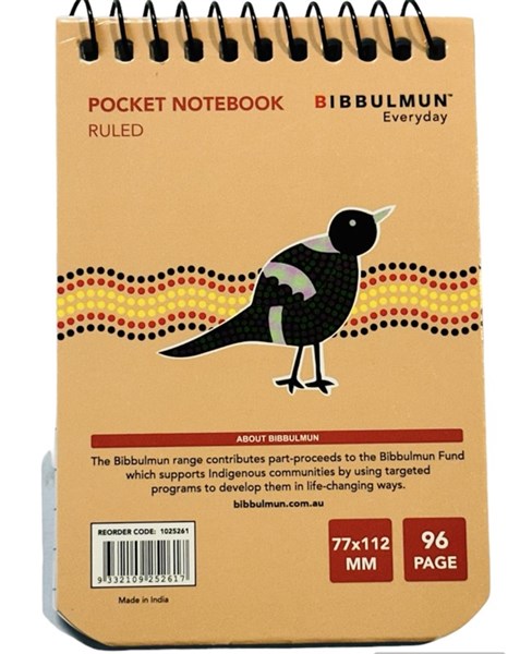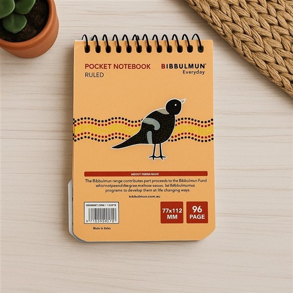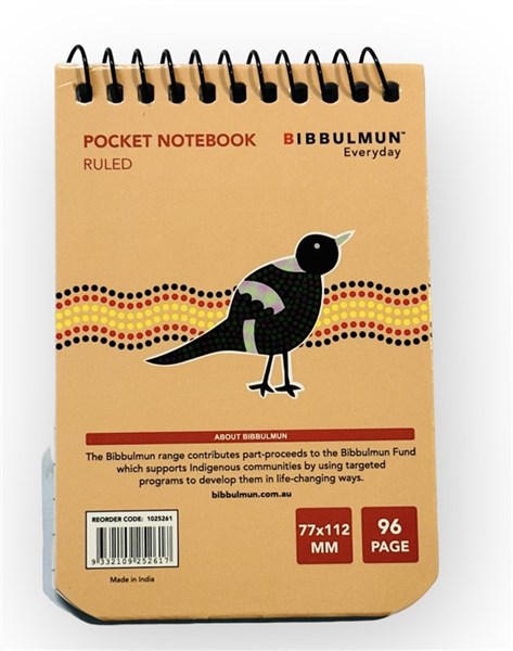 Bibbulmun Pocket Notebook - 77mm x 112mm - 96 Ruled Pages The Bibbulmun Pocket Notebook is the perfect companion for everyday thoughts, reminders, creative ideas, or quick notes on the go. Designed for practicality and style, this compact notebook slips easily into your pocket, purse, or backpack – making it ideal for students, professionals, and creatives alike. With a sturdy twin-wire spiral binding and premium quality ruled pages, writing is smooth and comfortable whether you’re standing, commuting, or sitting at your desk. The pages are crafted to reduce ink bleed-through and smudging, making them suitable for pens, pencils, and markers. This notebook is not just a writing tool – it's a small but meaningful way to support ethical and socially responsible products. The Bibbulmun range contributes part-proceeds to the Bibbulmun Fund and is identified by the distinctive magpie icon. The Bibbulmun Fund invests in targeted community projects that are run by community members and have support from local leaders. It encourages, supports and inspires Indigenous communities across Australia.