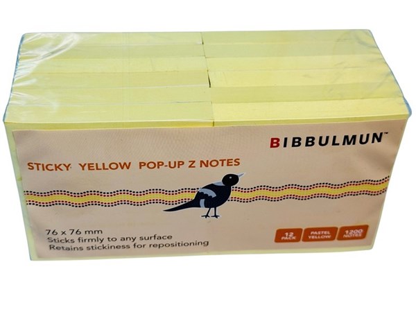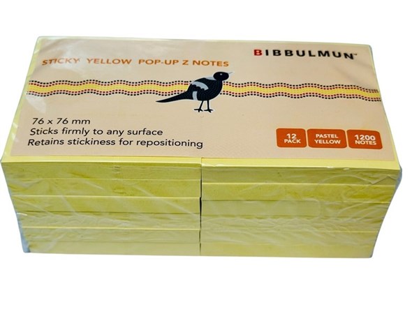 Bibbulmun Pop-Up Z Line Sticky Notes 76mm x 76mm – Pastel Yellow, 12 Pack (1200 Notes)
