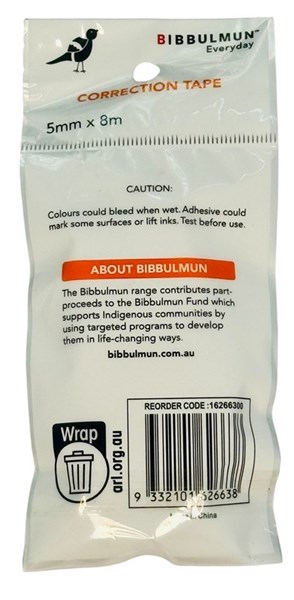 Bibbulmun Sidewinder Correction Tape 5mm x 8m – Hang Sell Pack The Bibbulmun Sidewinder Correction Tape delivers smooth and precise coverage in a sleek, ergonomic design. With a compact, transparent body that shows remaining tape, this tool is essential for fast, clean corrections whether you're at school, home, or the office. Its side-dispensing mechanism offers greater control and visibility for neat and accurate results. The Bibbulmun Fund invests in targeted community projects that are run by community members and have support from local leaders. It encourages, supports and inspires Indigenous communities across Australia.