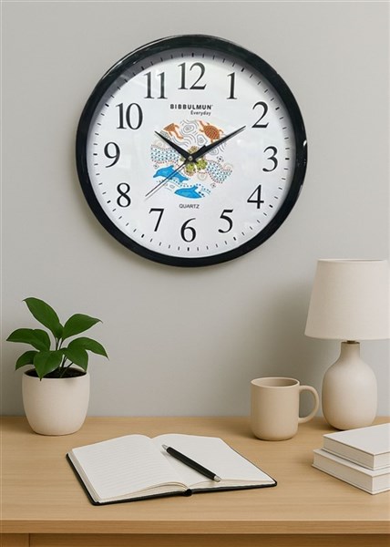 Enhance your space with the Bibbulmun Wall Clock, a perfect blend of cultural artistry and everyday functionality. With a 30cm diameter, this wall clock features a precision quartz movement and showcases a striking Indigenous-inspired design at its center, bringing a meaningful aesthetic to any room. Framed in a sleek black casing and featuring large, easy-to-read numerals, this clock complements both modern and traditional interiors. Whether in your home office, living room, or classroom, the Bibbulmun Wall Clock does more than tell time—it tells a story.