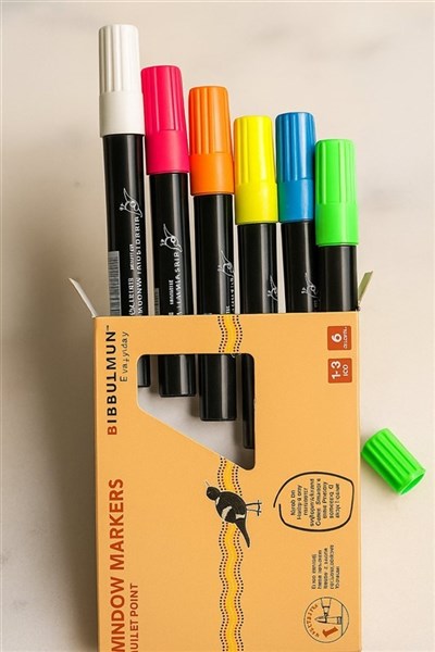 Window Markers – Pack of 6 Assorted Colours Non-Permanent Markers for Glass, Windows & Other Non-Porous Surfaces Bring creativity and colour to your glass surfaces with this vibrant 6-pack of Window Markers. Perfect for home, school, or office use, these markers write smoothly on glass, mirrors, whiteboards, and other non-porous surfaces. They are non-permanent and wipe off easily with a damp cloth, making them ideal for temporary messages, decorative artwork, signs, or event displays. With 6 bold assorted colours, these markers offer high visibility and clean results every time — perfect for both artistic and functional purposes.