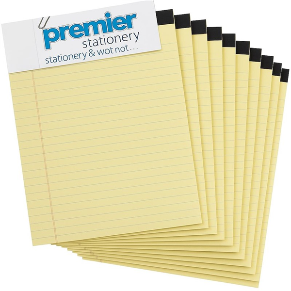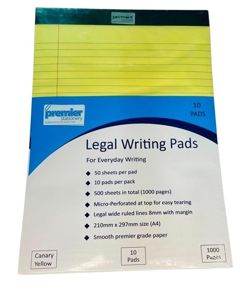 Premier Legal Writing Pads – Canary Yellow, 50 Sheets per Pad, 10 Pads (A4 Size, Wide Ruled) Stay organized and productive with Premier Legal Writing Pads, the ultimate solution for efficient note-taking, drafting, and organizing thoughts. Designed for professionals, students, and anyone who values clarity in their writing, these pads offer both function and finesse. Each pad features premium-grade canary yellow paper, wide ruled with margins, and is micro-perforated for clean sheet removal. Whether you're in the office, the classroom, or working from home, these legal pads are built to meet your daily writing demands. With 10 pads per pack and 50 sheets per pad, you get a generous 1000 pages of smooth writing surface, ensuring you never run out when inspiration or planning strikes.
