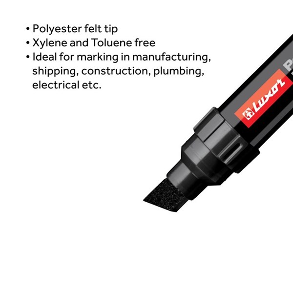 The Luxor Jumbo Permanent Marker is a super-sized marker perfect for marking in manufacturing, shipping, construction, plumbing, electrical etc. The chisel shaped jumbo tip is suitable for marking on large surfaces with a strong barrel and an extra-large ink tank. Alcohol based dark vivid ink dries quickly and resists both fading and water. Create clear fine lines with this jumbo marker which is well suited for variety of office tasks. These jumbo permanent markers feature hard Japanese polyester tip, no addition of Xylene/toluene, environment friendly made with recycled material, strong polypropylene barrel. Anti-clock rotation for extra safety. Low odour ink with ventilated cap. Its versatile chisel tip is perfect for countless uses in the classroom, office, home, and beyond. Always replace cap after use.