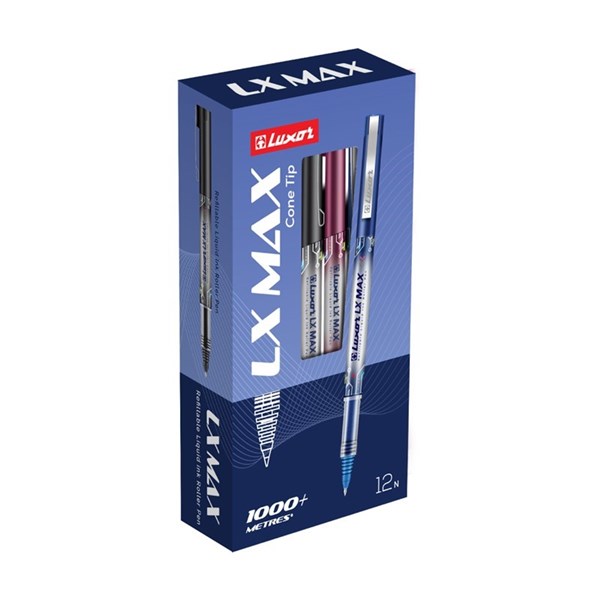 The Luxor LX Max Cone Tip Pen (Pack of 12) is designed for long-lasting, ultra-smooth writing performance. Equipped with advanced German ink technology, these pens deliver consistent ink flow for effortless writing every time. With waterproof ink available in Black, Blue, and Red, the LX Max pen ensures durability and clarity on paper. Built for both students and professionals, its cone tip design provides precision and comfort, while its long-lasting ink capacity (1000+ metres) makes it perfect for extended writing tasks. Reliable, smooth, and stylish – Luxor LX Max is your everyday writing partner.