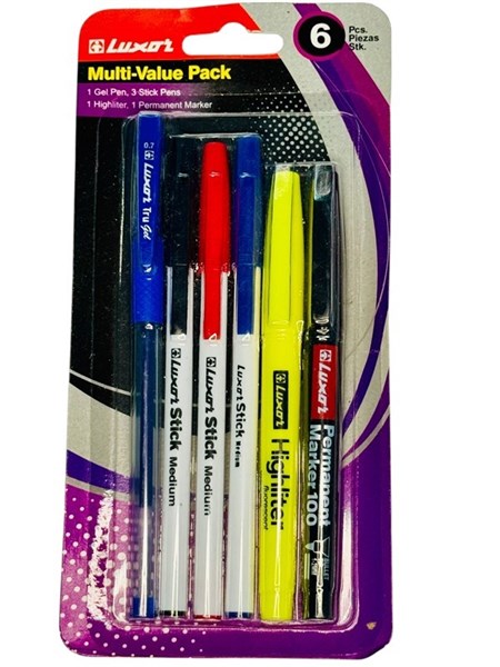 Luxor Multi-Value Pack – 6 Pc Stationery Kit with Pens, Highlighter & Marker