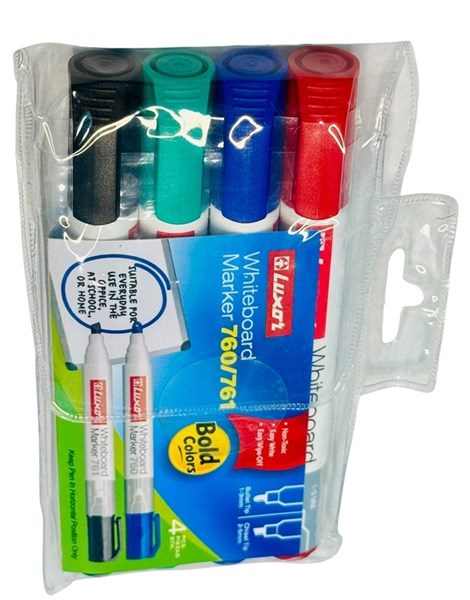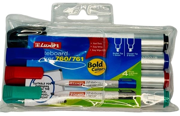 The Luxor Whiteboard Marker 760 is designed for smooth writing and easy erasability, making it the perfect choice for offices, schools, training rooms, and homes. This wallet pack includes 4 vibrant assorted colours (Black, Blue, Red, Green) with bullet tips for bold and clear writing. The markers feature a quick-drying, low-odor ink formula that wipes off easily without leaving stains, ensuring your whiteboard stays clean and fresh after every use. Ideal for daily use in meetings, classrooms, or home study sessions, these markers are both reliable and long-lasting.