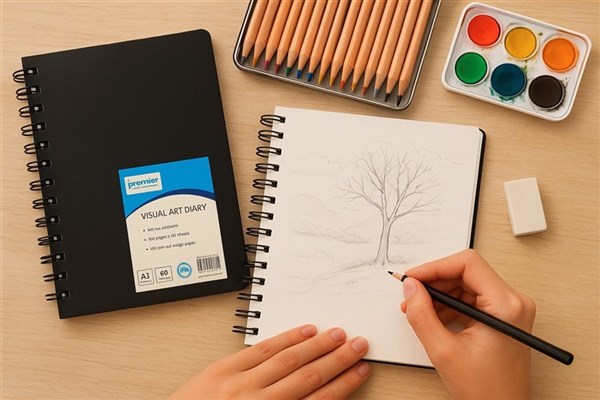 Premier A5 Visual Art Diary – 125gsm Cartridge Paper, 120 Pages Unleash your creativity with the Premier A5 Visual Art Diary, designed for students, artists, and professionals who love to sketch, draw, or jot down creative ideas. This high-quality spiral-bound diary features 60 sheets / 120 pages of premium 125gsm cartridge paper, making it perfect for pencils, pens, markers, and light washes of paint. Its A5 compact size (148 x 210mm) ensures easy portability, while the sturdy black cover provides durability and a professional finish. Whether for school, art projects, or personal creativity, this diary is the ideal companion for your artistic journey.