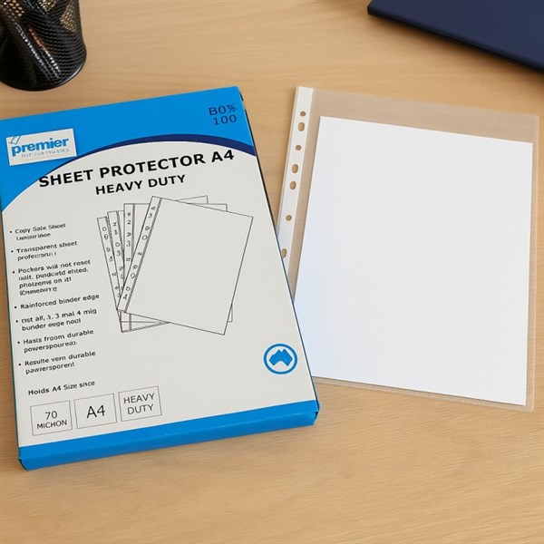 Premier Sheet Protector A4 – Crystal Clear, Heavy Duty, 70 Micron Thickness (Buy in Multiples of 12) Protect and preserve your important documents with Premier A4 Sheet Protectors. Crafted from heavy-duty 70-micron crystal-clear polypropylene, these sleeves provide superior durability while keeping your documents easily readable. They are copy-safe, ensuring no reaction with photographs, photocopies, or printed text, making them ideal for both professional and personal use.