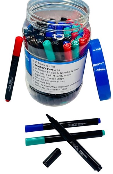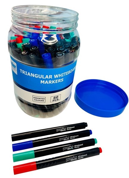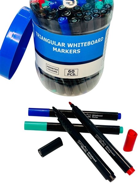 Premier Triangular Grip Whiteboard Markers - Bulk Pack 60pcs – Assorted Colours – Non-Toxic Upgrade your classroom or office with the Premier Triangular Grip Whiteboard Markers – the ultimate choice for smooth writing and easy erasing. This bulk value pack of 60 markers includes 24 black, 12 blue, 12 red, and 12 green markers, making it perfect for teachers, trainers, and professionals. Designed with an ergonomic triangular barrel, these markers provide superior comfort and control during long writing sessions. The bullet tip (1–2mm) ensures precise, bold lines, while the vivid quick-dry ink wipes clean effortlessly without leaving stains. Made with non-toxic ink and ASTM safety-approved, these markers are safe for classrooms, offices, and home use. A reliable essential for every whiteboard user.