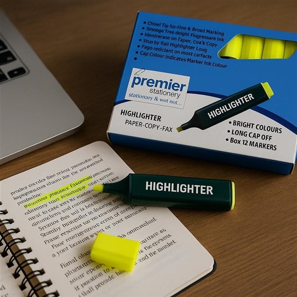Premier Yellow Highlighter Markers – Pack of 12 Stay organized and highlight important text effortlessly with Premier Stationery Yellow Highlighter Markers. Designed with a vibrant fluorescent yellow ink and a chisel tip for both fine and broad marking, these highlighters are ideal for students, professionals, and anyone needing clear visibility on paper, copy, or fax documents. The smudge-free ink dries quickly, and the flat, stubby design ensures a comfortable grip with long-lasting use. Whether for office, school, or home, this box of 12 delivers reliable quality with standout brightness.