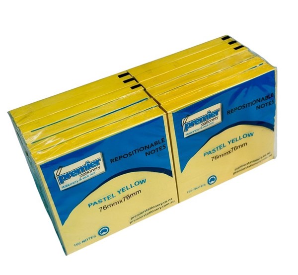 Sticky Notes Pastel Yellow 76mm x 76mm Pack 12 Bring clarity and efficiency to your daily routine with the Premier Repositionable Notes in Pastel Yellow. Designed to help you capture ideas, reminders, and important messages with ease, these premium sticky notes are an essential tool for every organized workspace—whether at home, in the office, or in a classroom. Each note measures 76mm x 76mm, offering just the right amount of space for concise and effective communication. The soft pastel yellow shade provides a subtle yet visible background, ensuring your notes stand out without overwhelming your documents or workspace aesthetics. This value pack includes 12 pads, with 100 sheets per pad, making it ideal for professionals, educators, students, or anyone who frequently needs quick access to reliable notepaper. Whether you’re organizing projects, color-coding tasks, or jotting down ideas on the go, Premier’s repositionable notes help you stay in control and on top of everything.